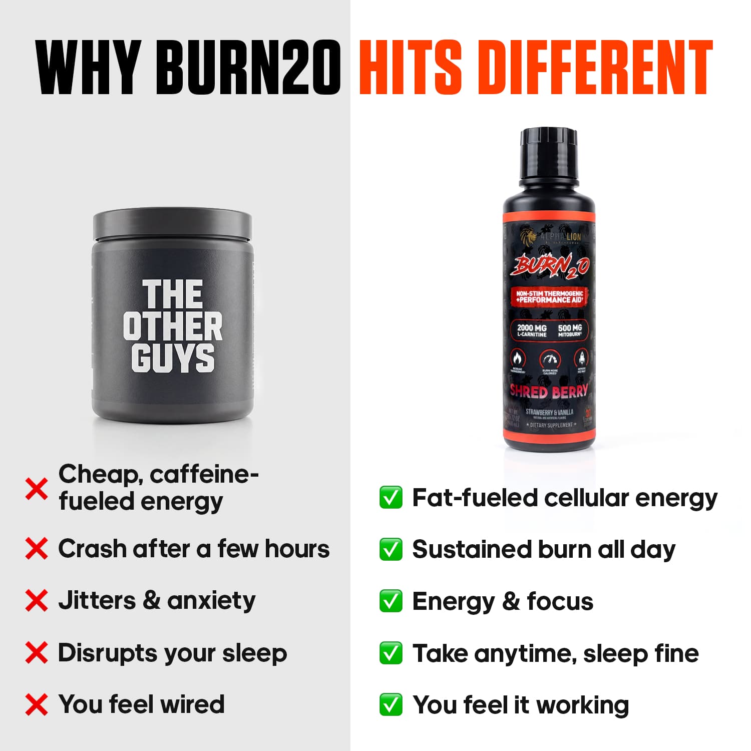 Unlike pills or powders that sit in your stomach, Burn2O's liquid format absorbs directly into your bloodstream within minutes. The 2000mg of L-Carnitine immediately begins circulating, preparing to shuttle fatty acids into your cellular powerhouses (mitochondria) where they'll be incinerated as fuel.
