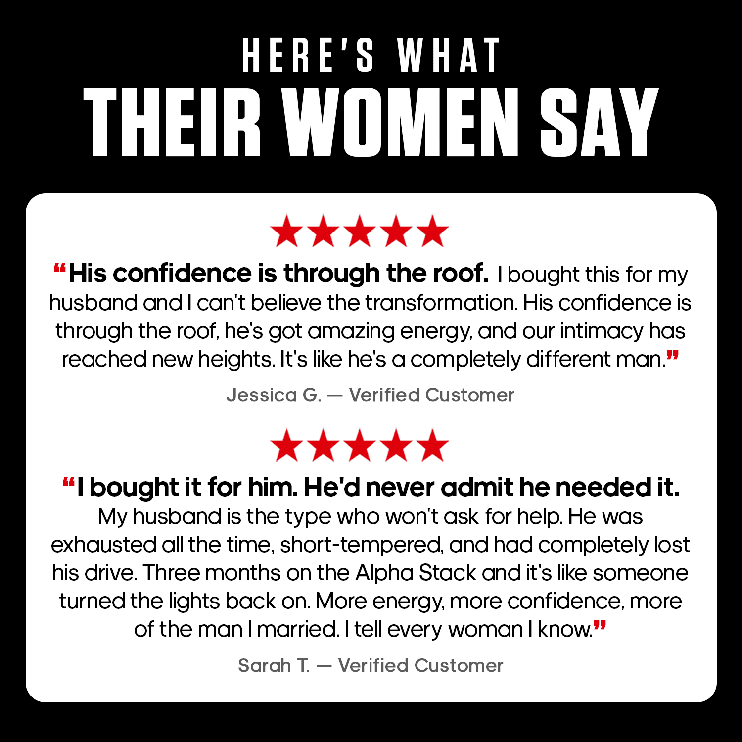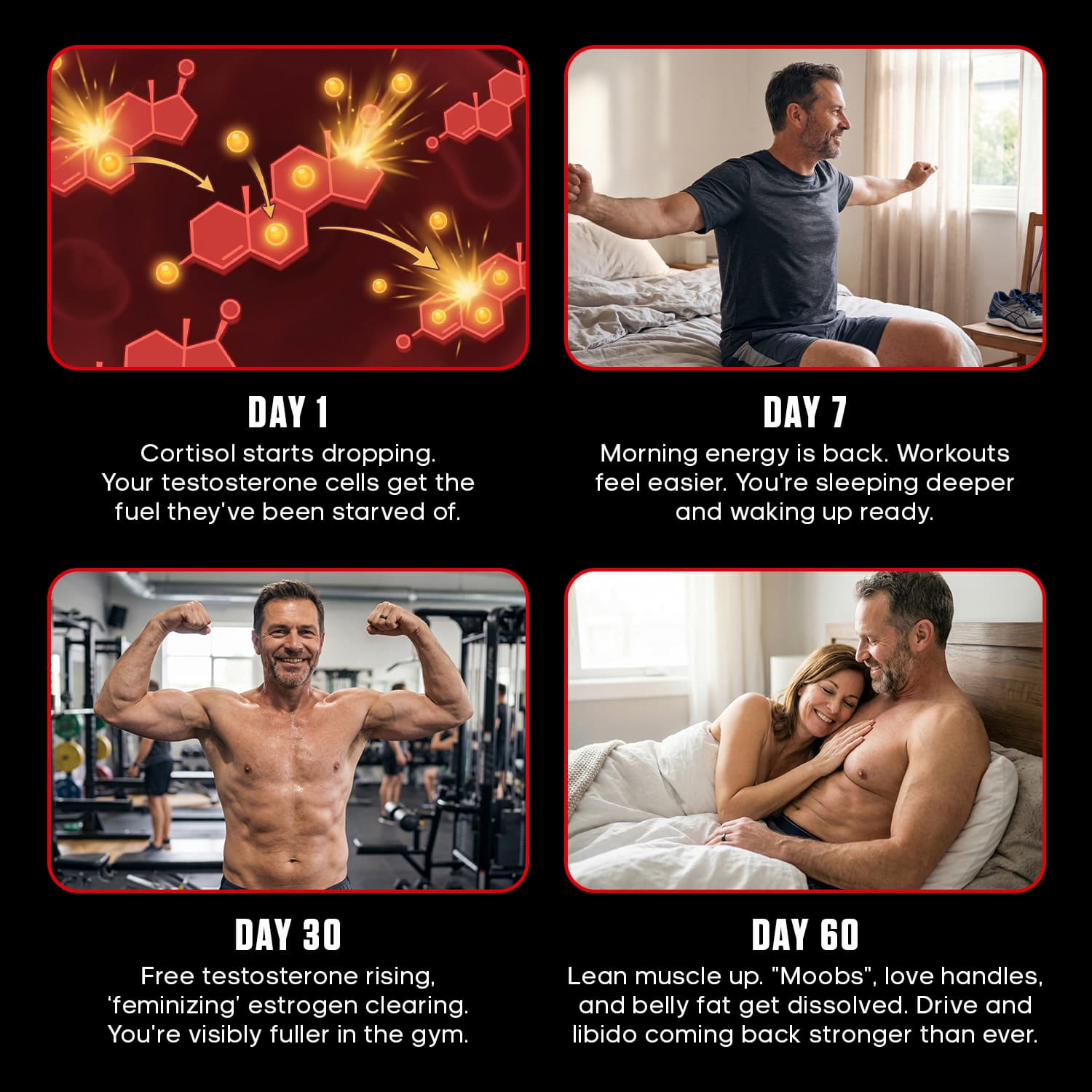 "My confidence had tanked and my wife noticed. A month in, I feel like myself again — more drive, more presence, more energy where it counts."